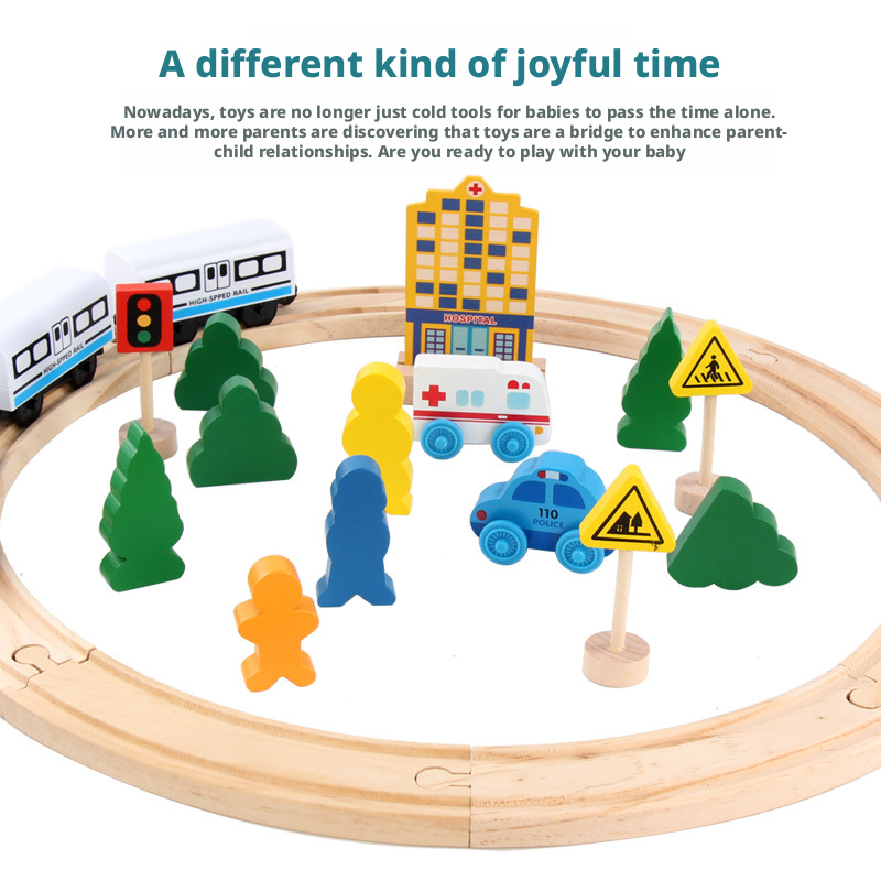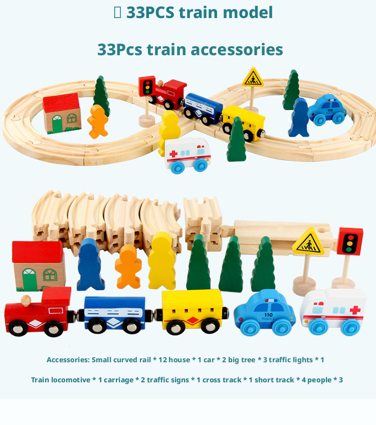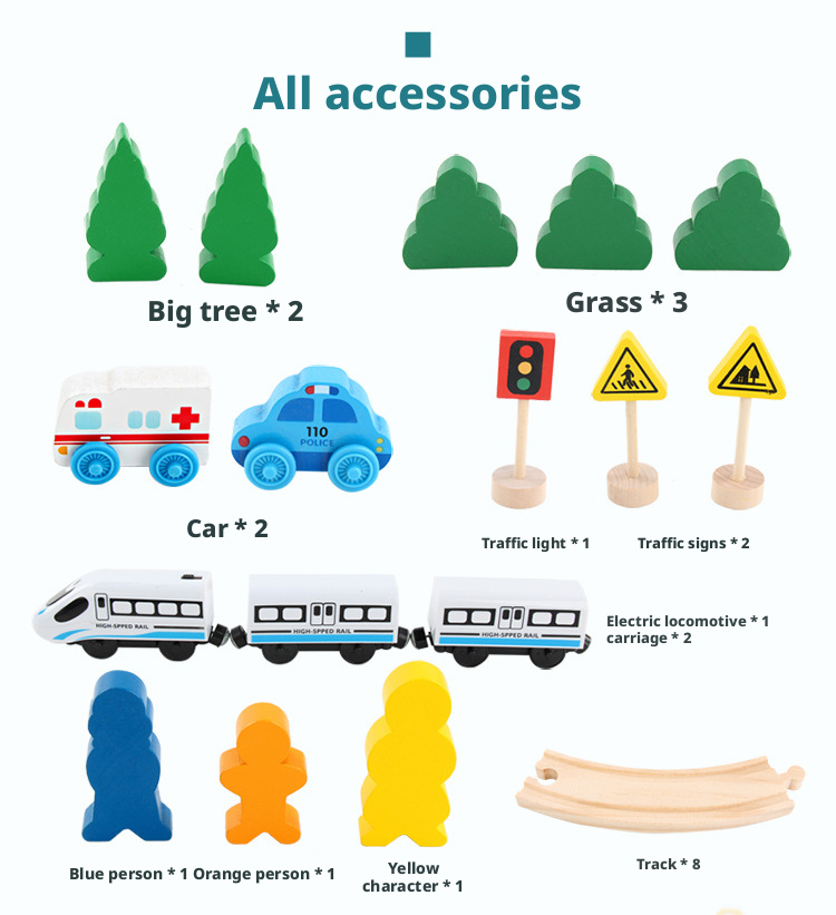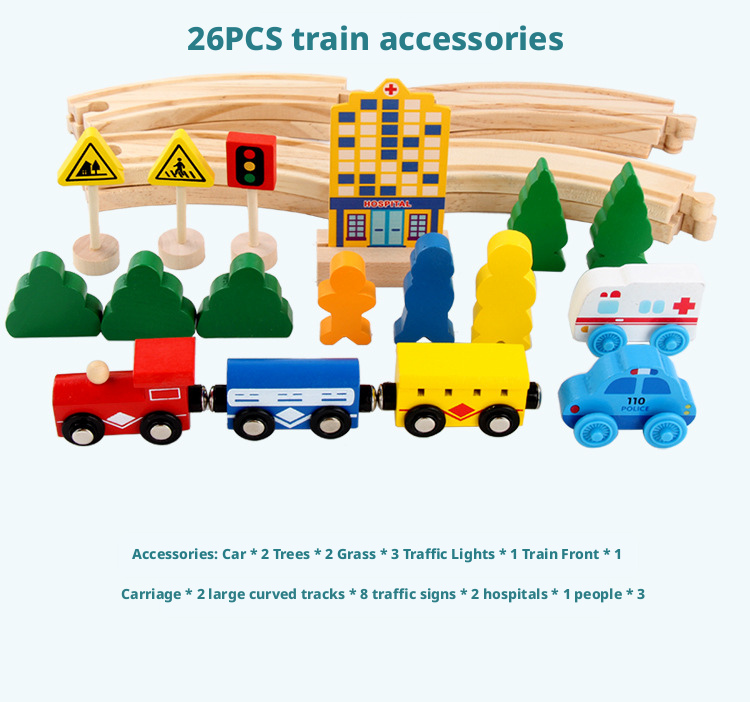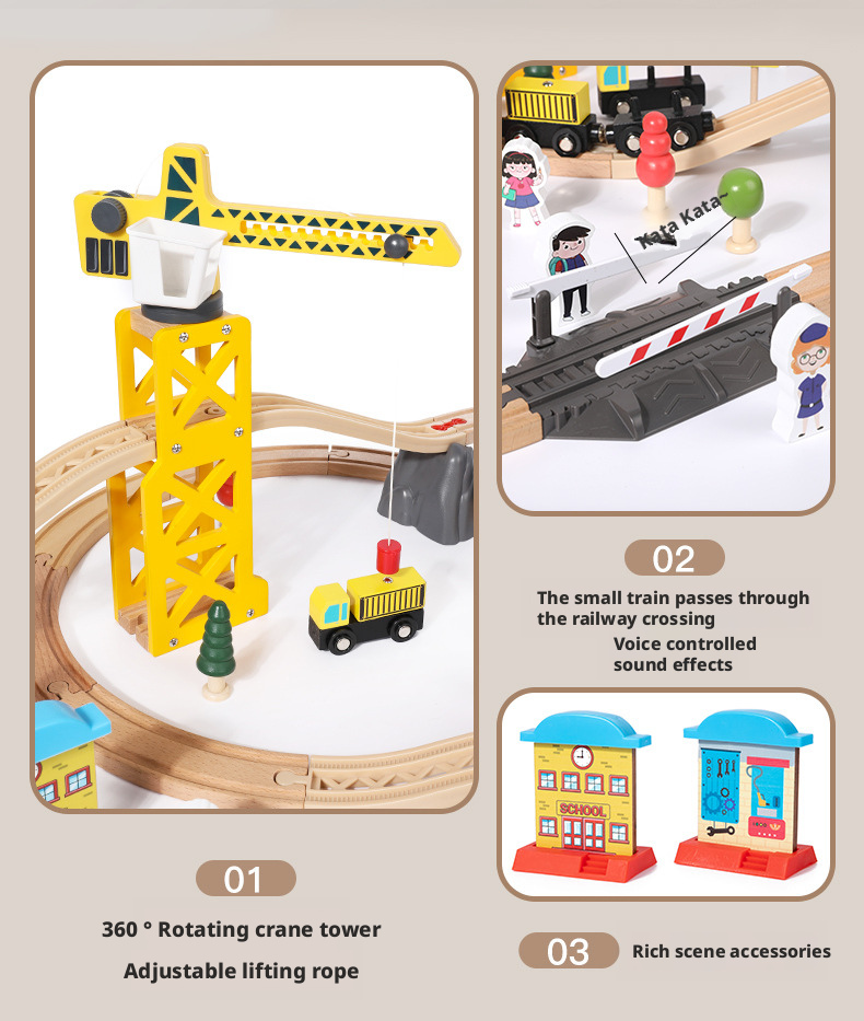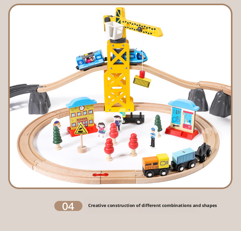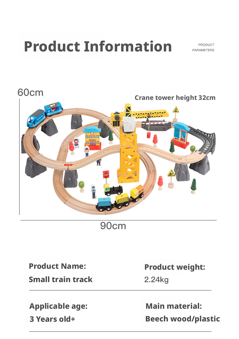 مصنوعة من خشب متين وآمن للأطفال، تتميز كل مجموعة بوصلات مغناطيسية سلسة وقضبان سكة حديدية مقطوعة بدقة لتركيب ثابت. يوفر إصدار القاطرة الكهربائية حركة آلية لمزيد من الواقعية، بينما تشجع الإصدارات اليدوية على اللعب التفاعلي المباشر.