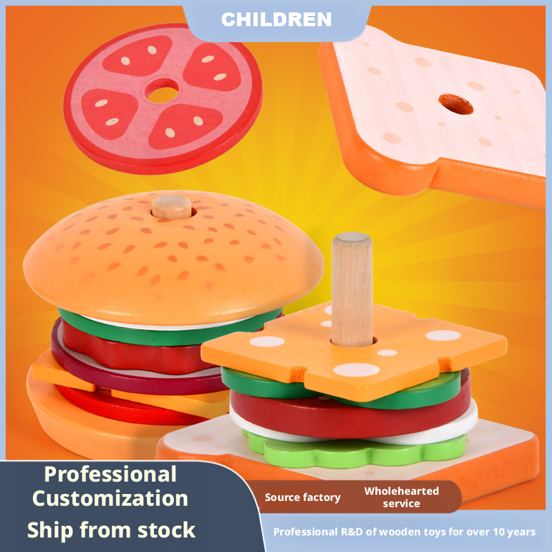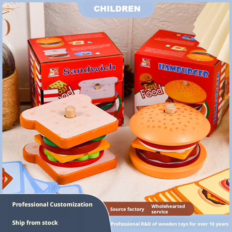 مجموعة مطبخ خشبية للعب التخيلي على شكل برجر وساندويتش - لعبة تكديس الوجبات السريعة للأطفال